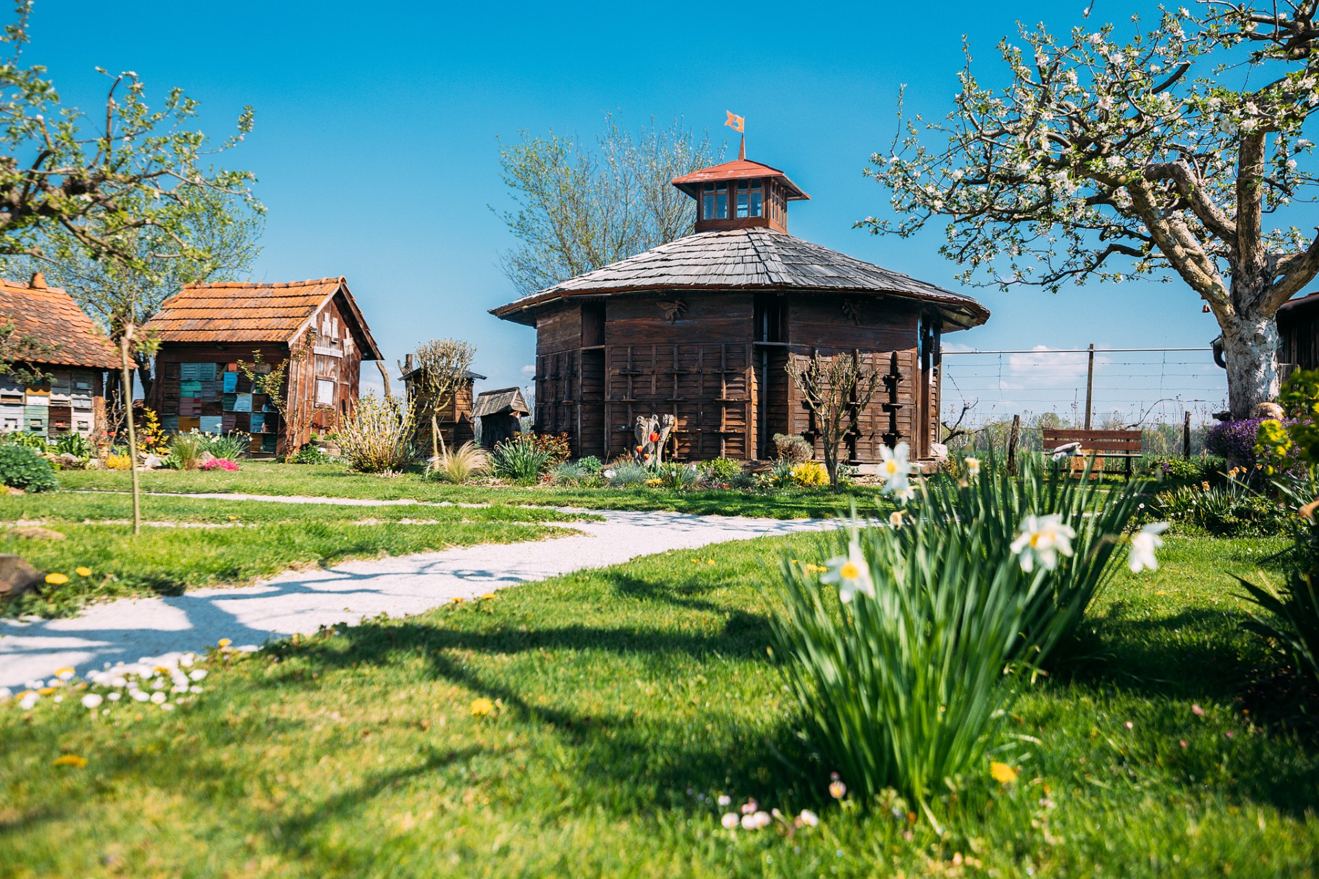 Čudovito podobo posestva dopolnjujejo zeliščni vrtovi, na katerih uspeva več kot 100 medovitih rastlin, učna pot s tablami o življenju čebel pa vodi do pravega, še delujočega čebelnjaka. V njem si lahko ogledate še preostanek zbirke, skozi stekleno steno pa je mogoče opazovati pridne čebelice na delu.