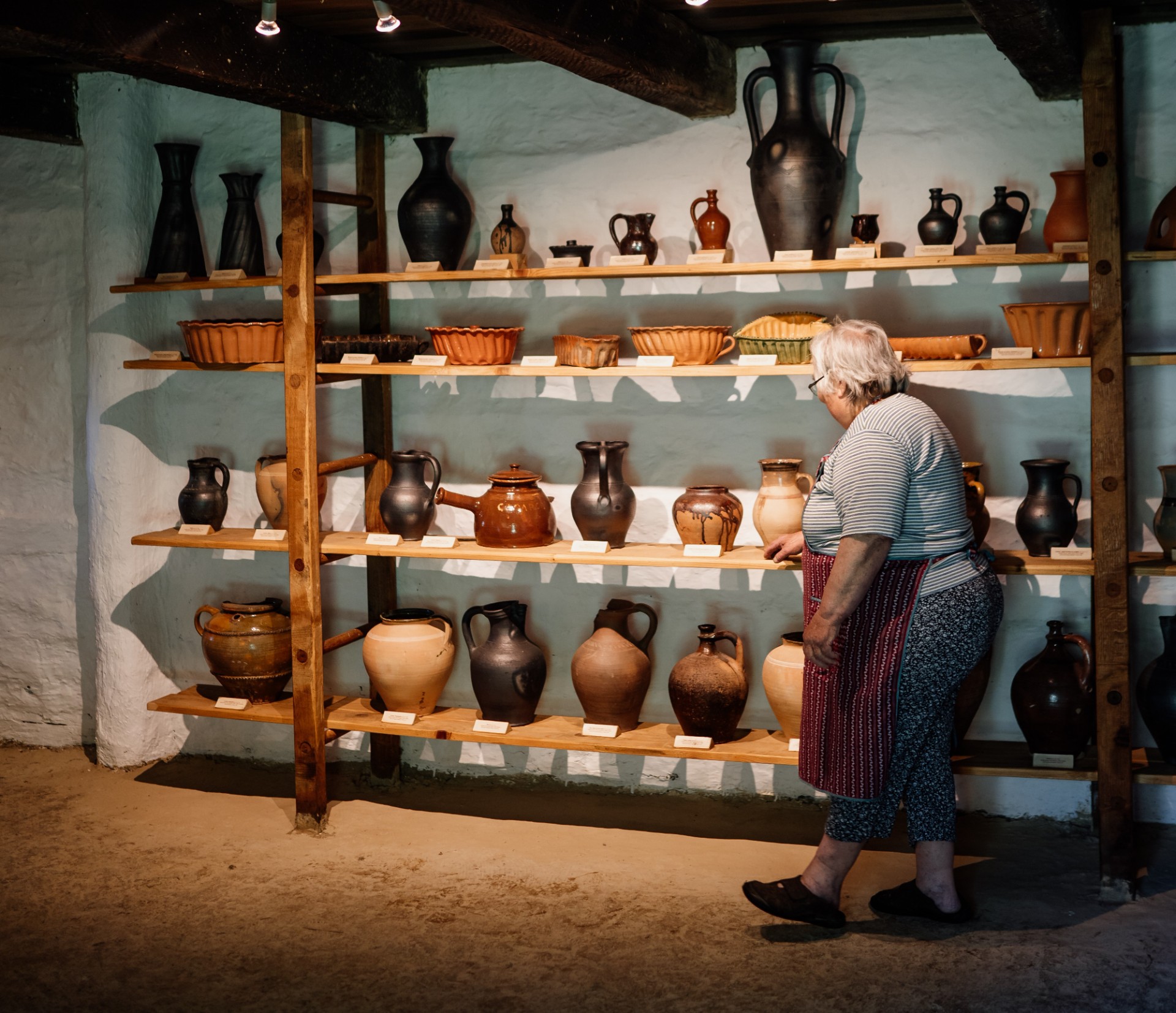 Pogled navzgor vam razkrije neometane lesene strope. Če pozorno pogledate prečne tramove, boste v njih prepoznali letnice (gradnje) in inicialke, ki pripadajo gospodarju. In če se ozrete še navzdol, opazite glinena tla.