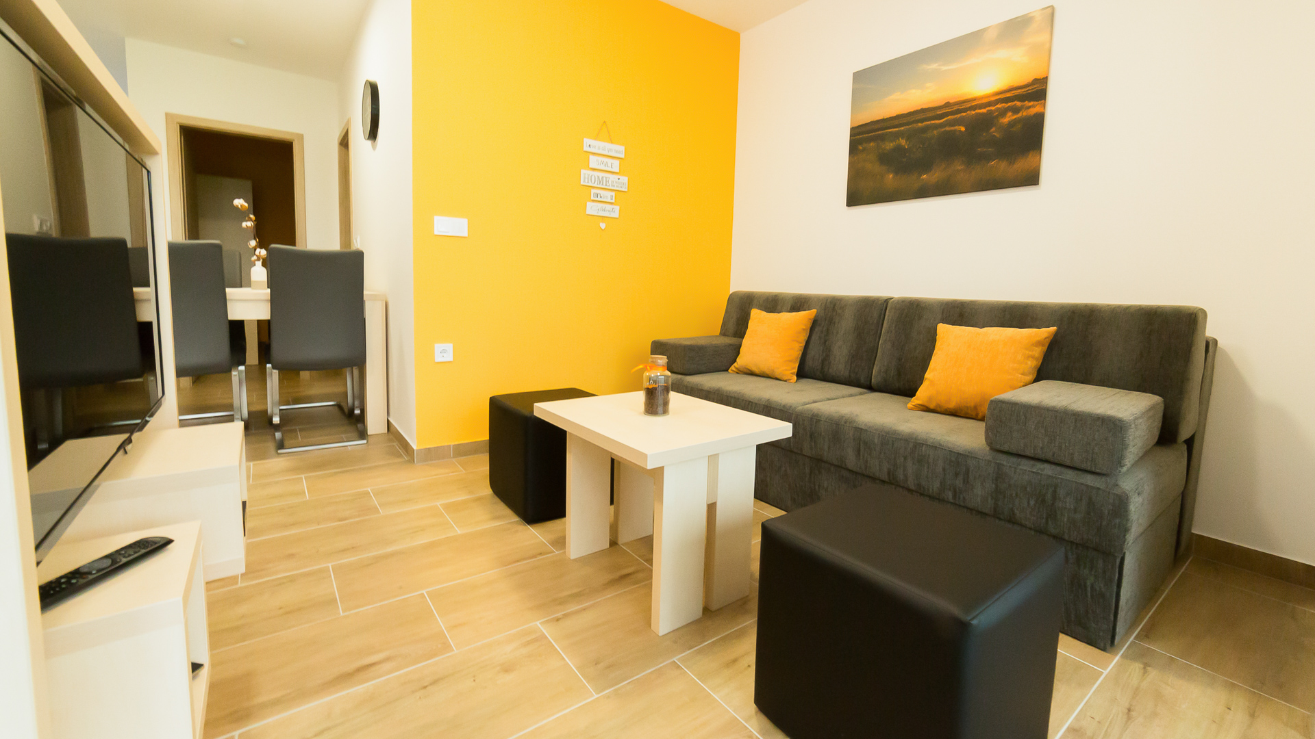 Die Apartments bieten Platz für bis zu 6 Personen. Die im Erdgeschoss haben eine Terrasse und die im ersten Stock haben einen Balkon. Ein separates Schlafzimmer mit einem großen Doppelbett, kleines separates Zimmer mit einem Etagenbett und ein ausziehbares Schlafsofa für zwei Personen im Wohnzimmer erwarten Sie. Die komplett ausgestattete Küche wird leidenschaftliche Köche, die ihre Kochkreationen auf der überdachten Terrasse servieren können, zufriedenstellen. Sie werden barfuß im Morgentau auf dem Rasen vor dem Apartment spazieren können.