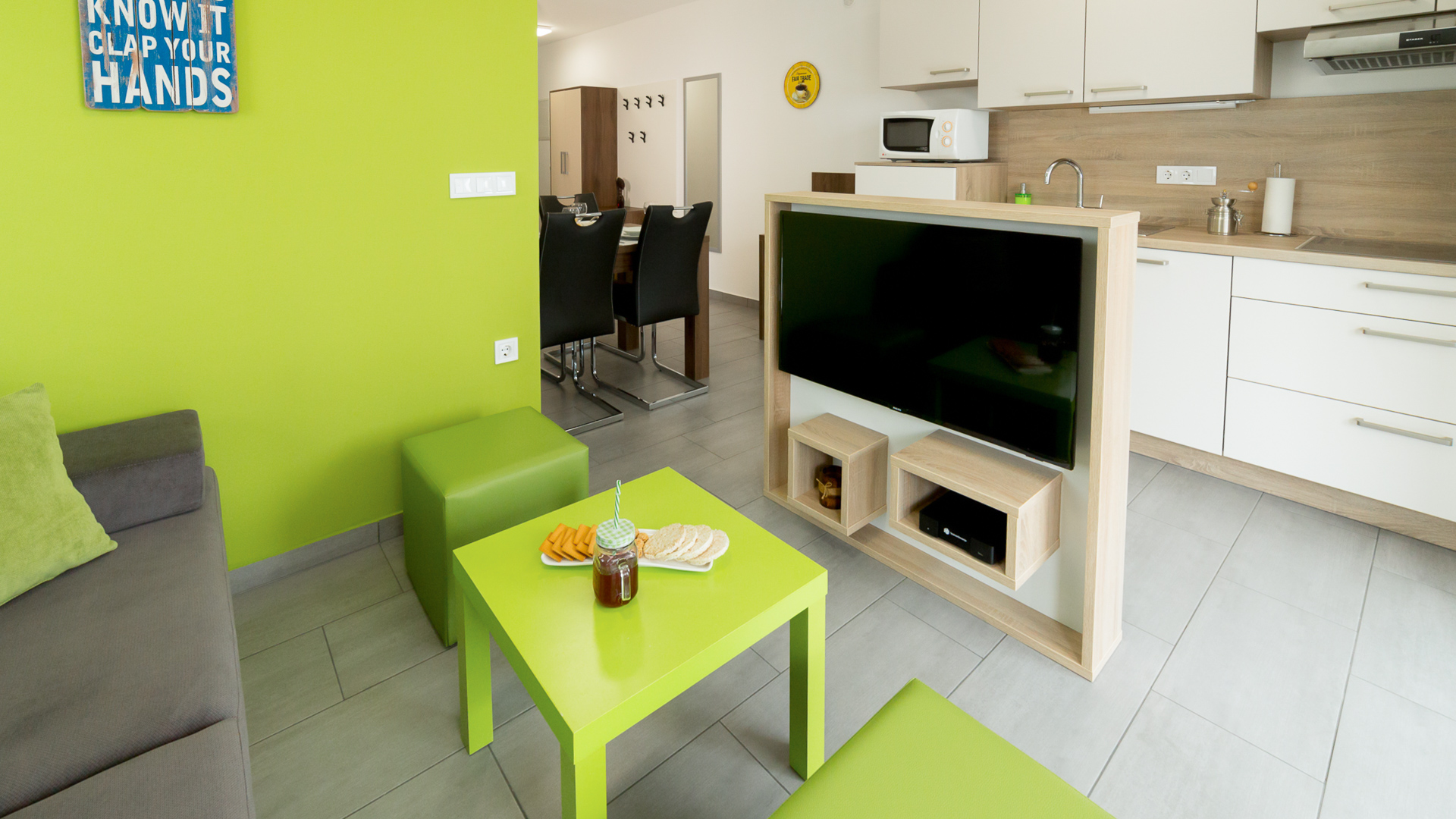 Die Apartments bieten Platz für bis zu 4 Personen. Die im Erdgeschoss haben eine Terrasse und die im ersten Stock haben einen Balkon. Ein separates Schlafzimmer mit einem großen Doppelbett und ein ausziehbares Sofa für zwei Personen im Wohnzimmer erwarten Sie. In der komplett ausgestatteten Küche werden Sie mit Vergnügen das Frühstück, das Mittagessen oder einfach nur einen Snack für zwischendurch zubereiten. Sie können auf der überdachten Terrasse oder Balkon entspannen oder auf der Grünfläche vor dem Apartment turnen.