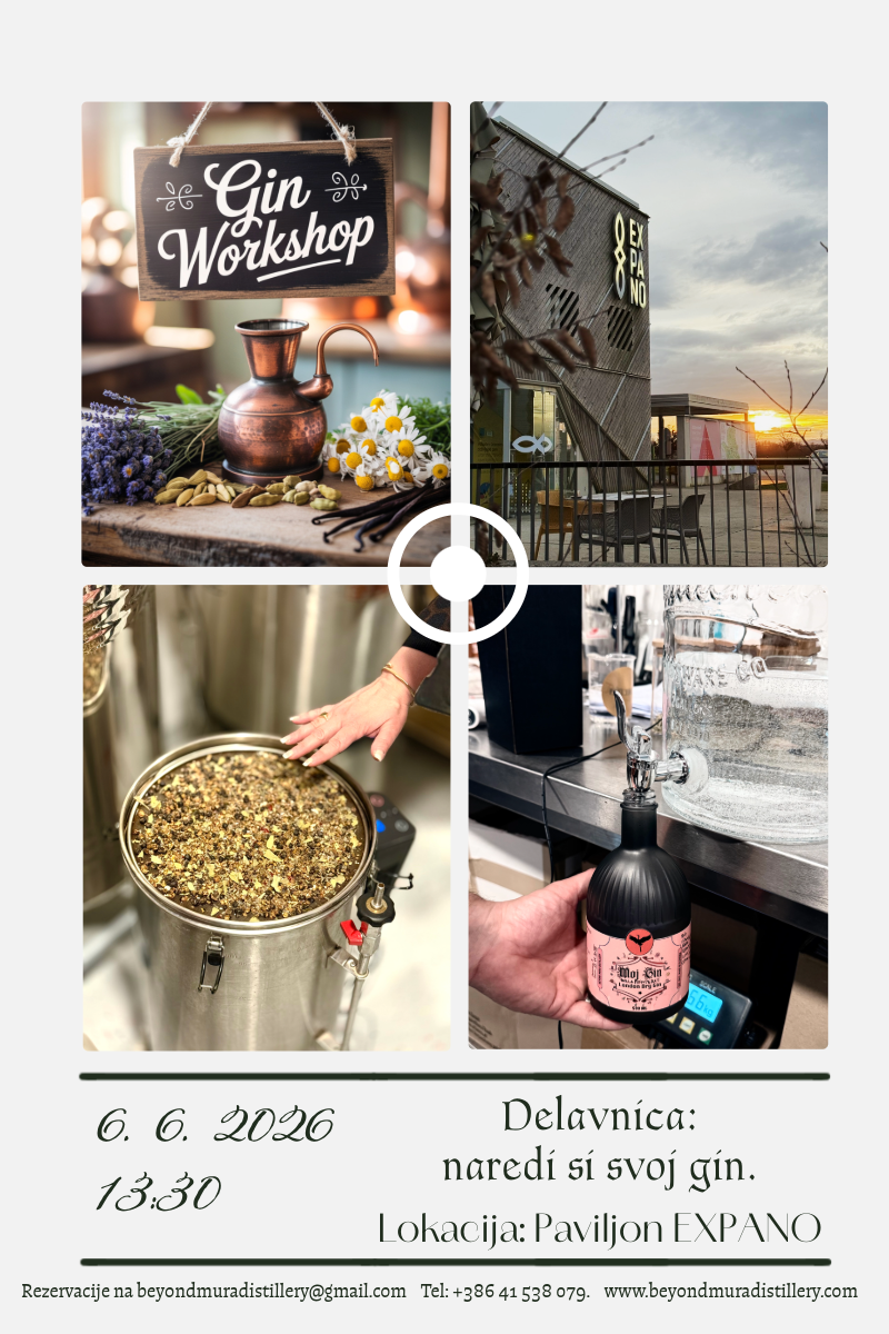 Z ostalimi udeleženci boste snovali edinstveni recept in tako proizvedli svojo lastno personalizirano steklenico London Dry gina (500 mL). Delavnica traja približno 3 ure in vključuje predavanje o destilaciji, vpogled v postopek destilacije, pijačo (alkoholno / brezalkoholno) ter prigrizke.
