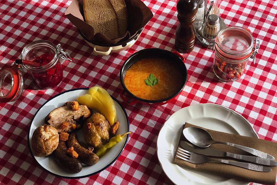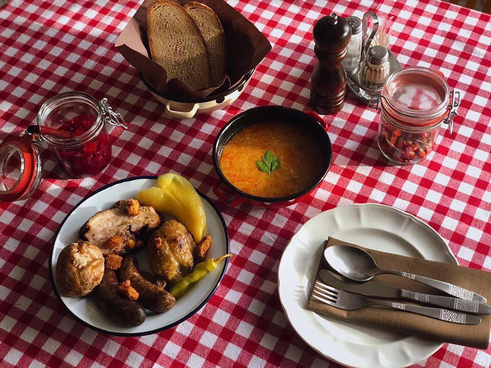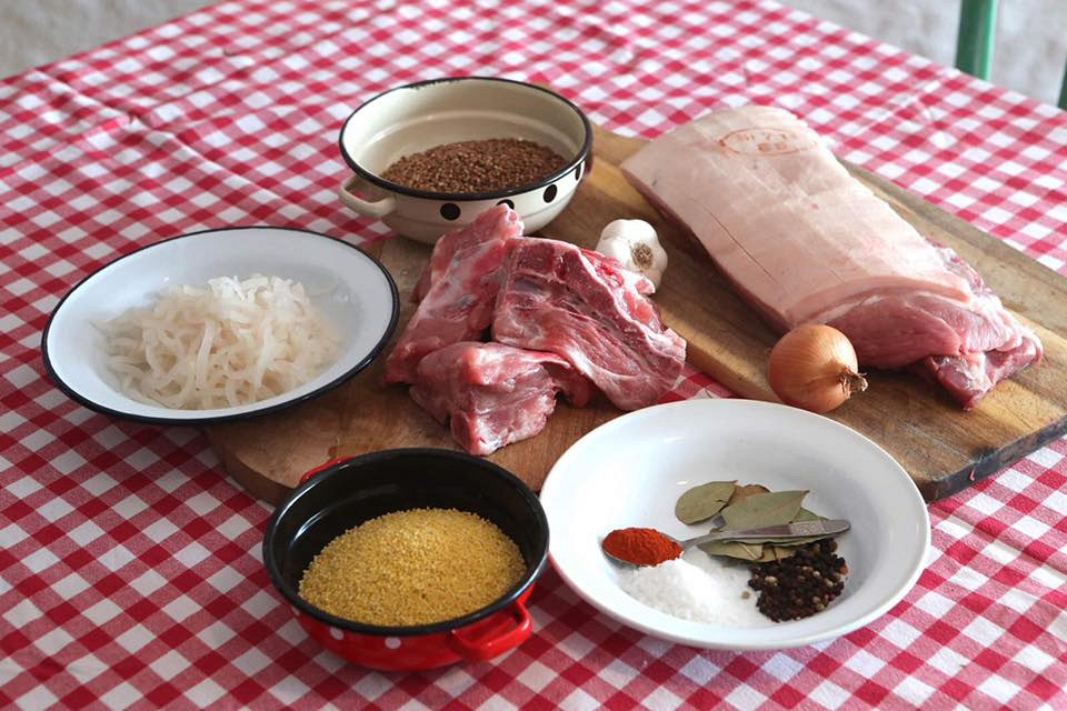 - Potem v večjo posodo vržemo svinjske kosti in jih pokrijemo s kislo repo, poprom v zrnu, lovorjevim listom in tremi olupljenimi stroki česna. Zalijemo z vodo, da pokrijemo vse sestavine, in kuhamo 45 minut.