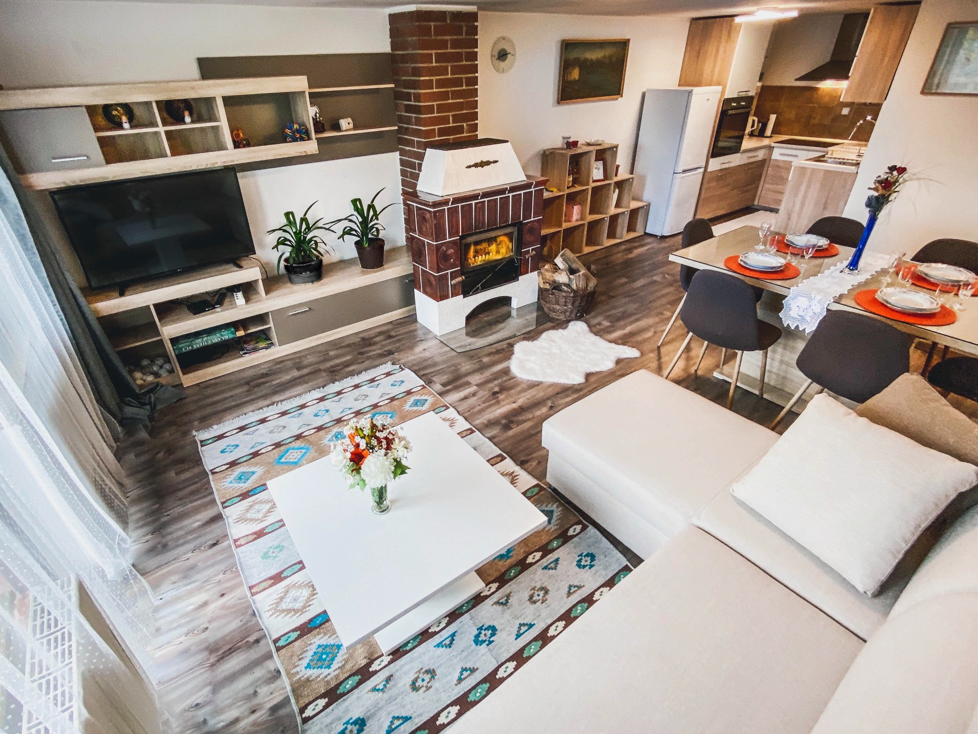 Hiša Pri jezeru je namenjena nastanitvi štirih oseb (zakonska postelja + pograd). Po želji se lahko raztegne tudi kavč, ki nudi dve dodatni ležišči.