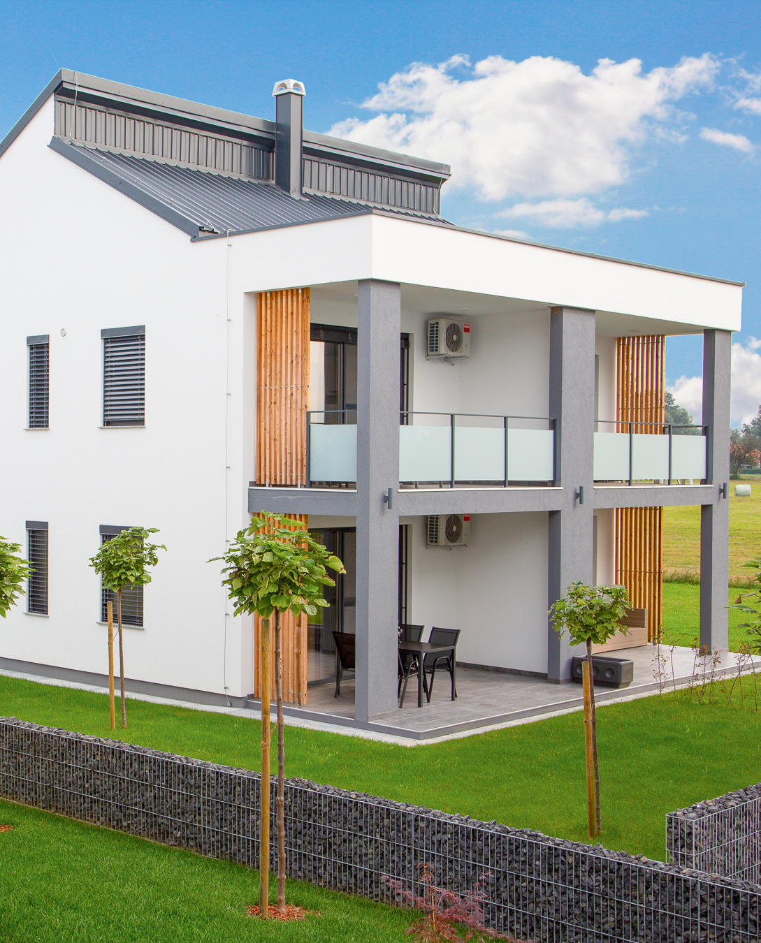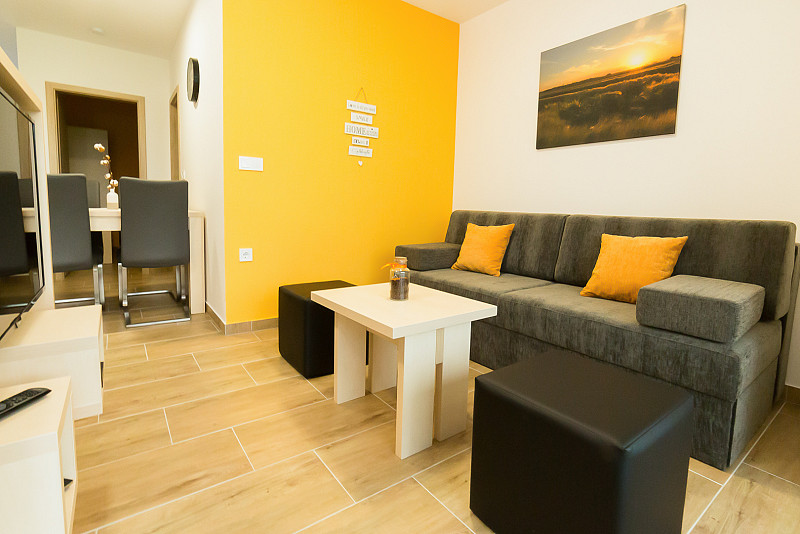Apartmaji sprejmejo do 6 oseb. V pritličju imajo teraso z zelenico, v prvem nadstropju pa balkon. Pričakuje vas ločena spalnica z zakonsko posteljo, manjša ločena soba z nadstropno posteljo in raztegljivo ležišče za dve osebi v bivalnem prostoru. Popolnoma opremljena kuhinja bo zadovoljila navdušene kuharje, ki boste svoje kuharske kreacije lahko postregli tudi na pokriti terasi ali balkonu. Bosi pa se boste lahko sprehodili po jutranji rosi na zelenici pred apartmajem.
